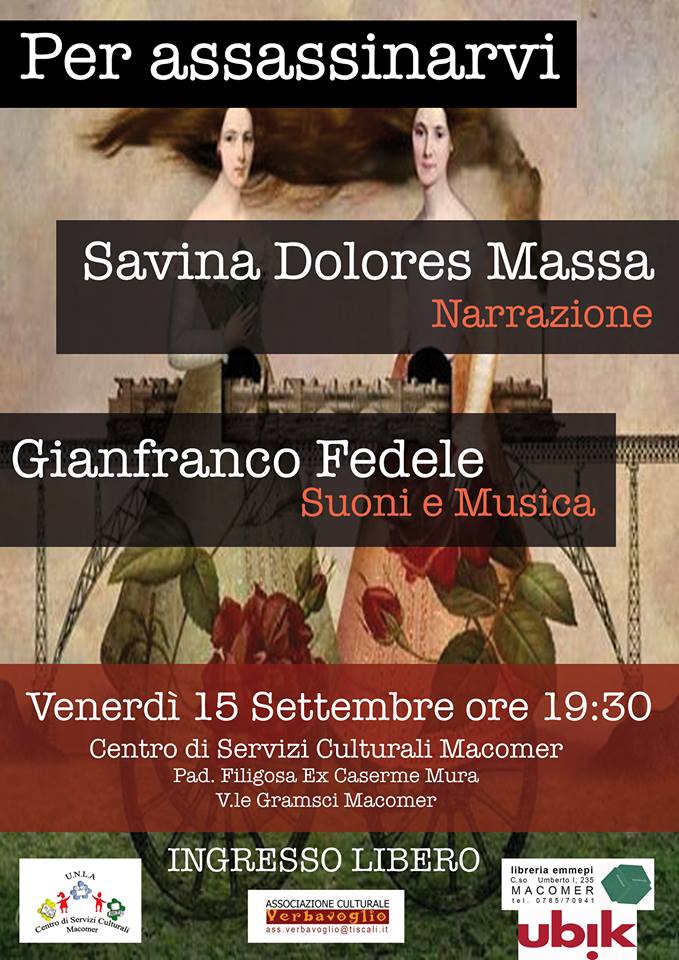 Il Centro Servizi Culturali, la libreria Emmepi Ubik e l’Associazione Culturale Verbavoglio hanno organizzato per venerdì 15 settembre alle 19,30 uno spettacolo dal titolo “Per Assassinarvi” – Immagini poetiche e musica di Savina Dolores Massa e Gianfranco Fedele.