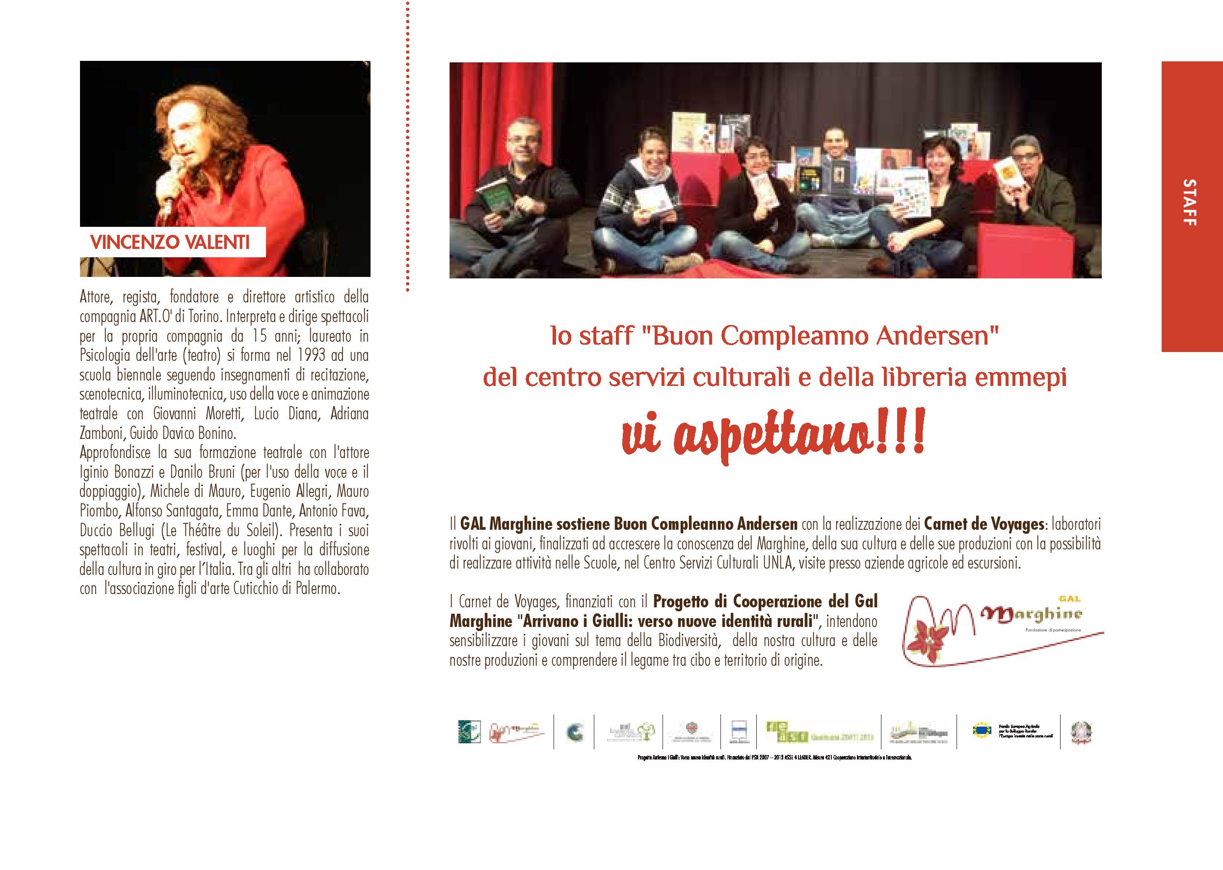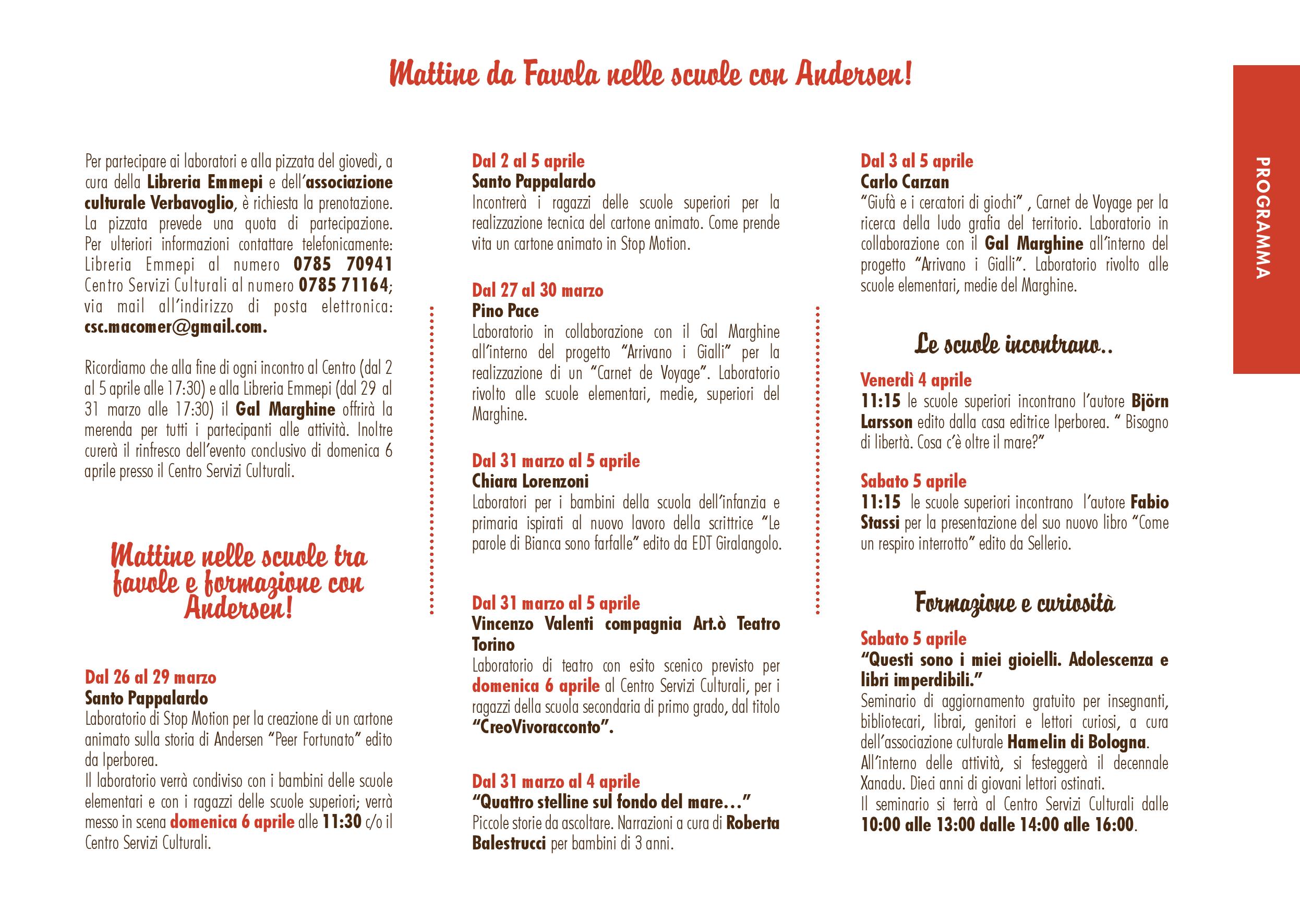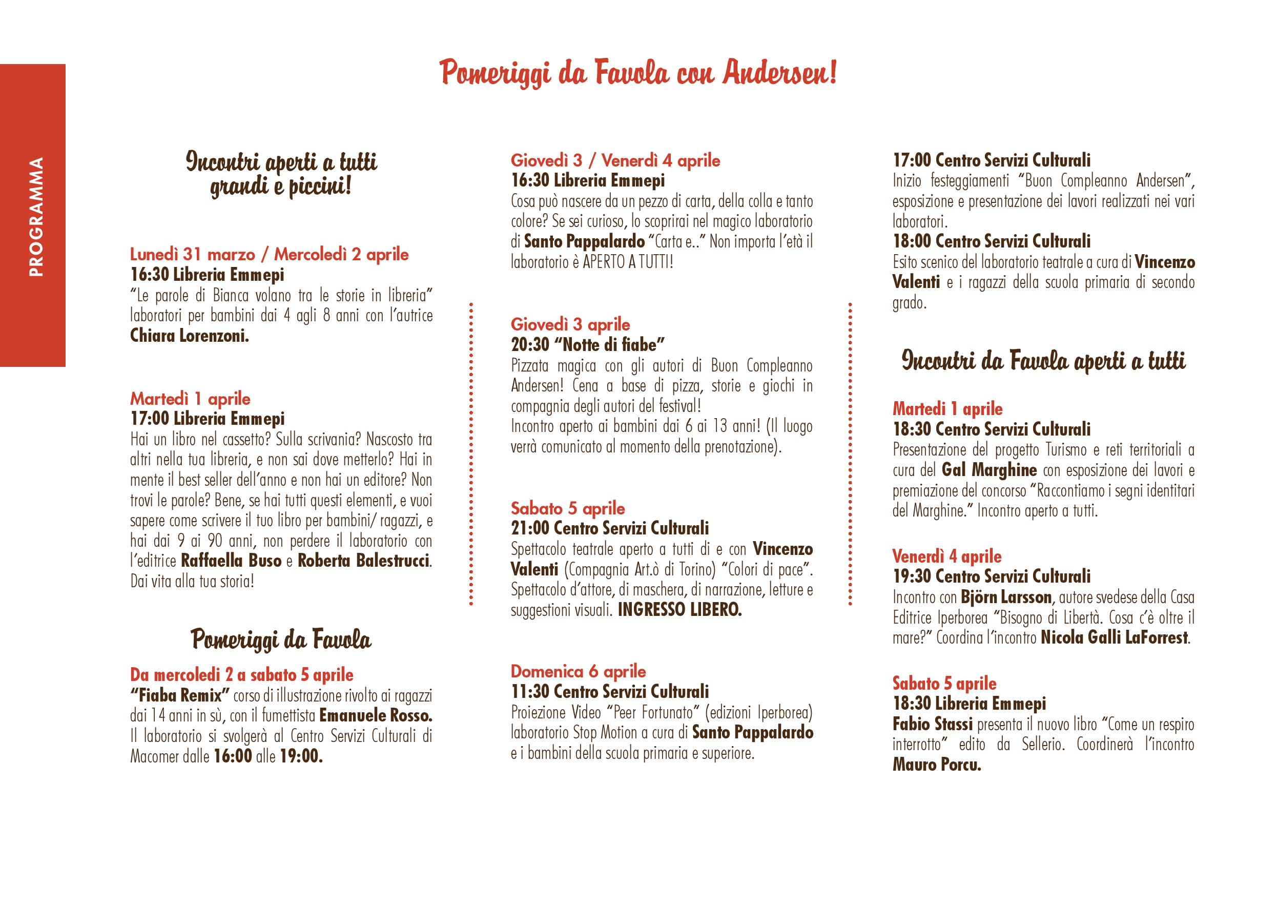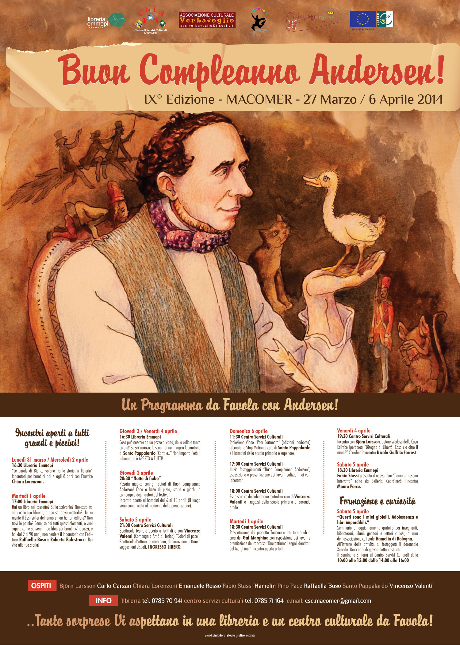 La manifestazione dal titolo “Buon compleanno Andersen!” si svilupperà dal 27 marzo al 6 aprile 2014. All’interno delle innumerevoli iniziative, dedicate a tutte le fasce d’età e in collaborazione con gli Istituti scolastici del Territorio e non solo e che si realizzeranno nelle Scuole, al Centro, in libreria, vi segnaliamo gli incontri gratuiti e aperti a tutti (in allegato trovate il programma completo con gli orari, i luoghi e gli ospiti presenti)