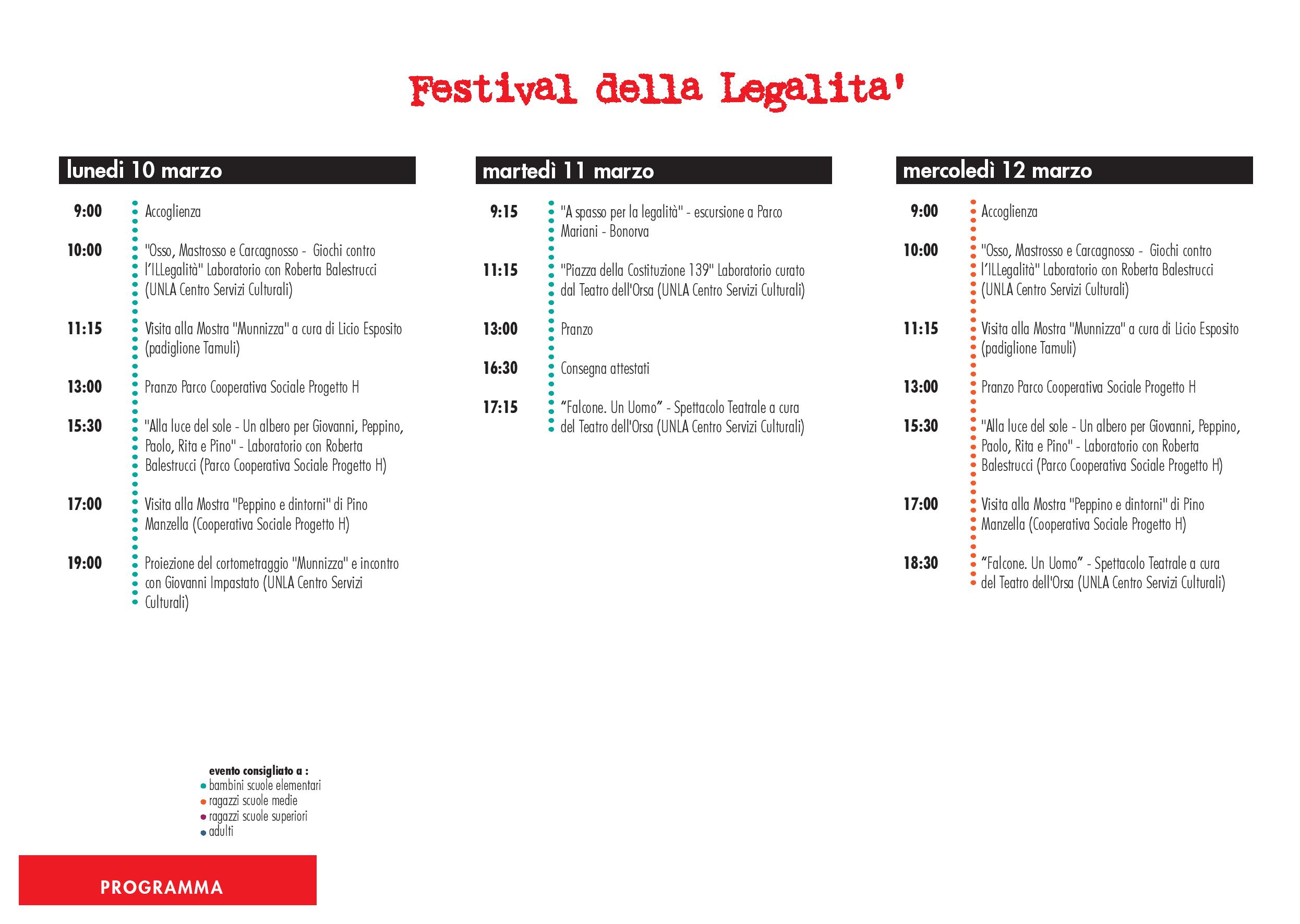 Siamo lieti di invitarvi al primo Festival della legalità in Sardegna “”Conta e Cammina. La LEGALITA’ appartiene al tuo sorriso che si svolgerà dal 10 al 15 Marzo tra Macomer – Ghilarza – Bonorva Si tratta di un Progetto itinerante sulla legalità, con esposizione di illustrazioni, mostre, incontri, proiezioni, laboratori e spettacoli teatrali sulla legalità. Il Progetto ideato dal Centro Servizi Culturali e dalla Cooperativa Sociale Progetto H, in collaborazione con Casa Museo Antonio Gramsci (Ghilarza), la libreria Emmepi, l’Associazione culturale Verbavoglio (Macomer) e Libera, Associazione nomi e numeri contro le mafie, ha coinvolto numerosi Istituti Scolastici che attraverso attività ludiche e di confronto, e l’utilizzo di diverse metodologie didattiche che saranno coinvolti e guidati ad affrontare argomenti come mafia, regole e legalità.