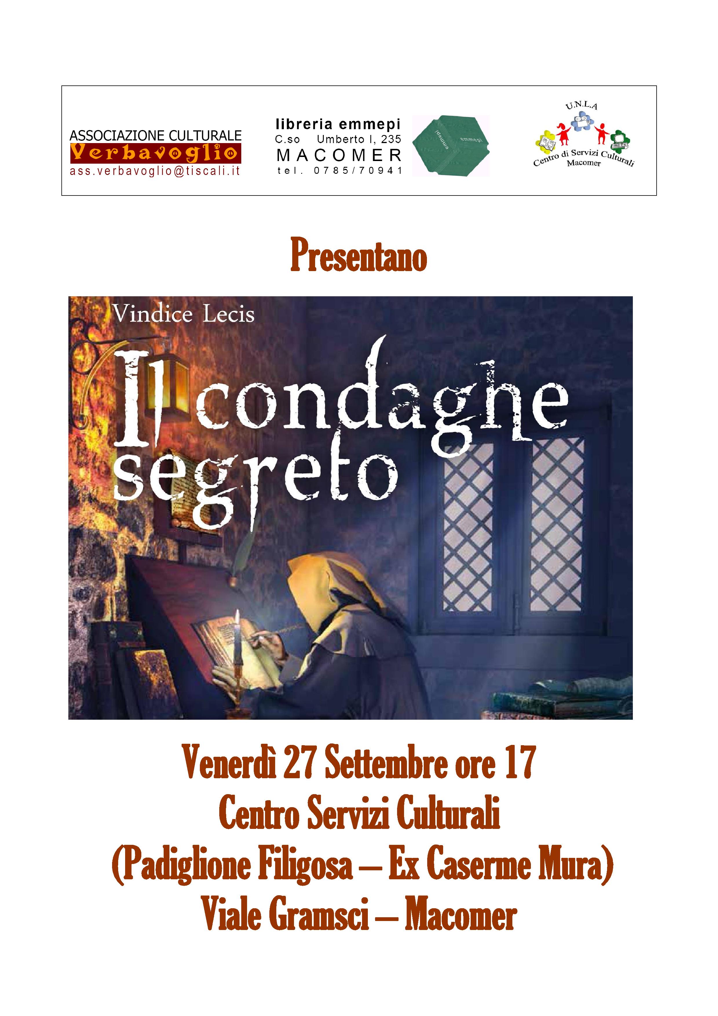 Il Centro Servizi Culturali di Macomer insieme all’associazione culturale Verbavoglio e alla libreria Emmepi presenterà il libro “Il Condaghe segreto” (Condaghes, 2013) in compagnia dell’autore, Vindice Lecis. L’incontro è previsto per venerdì 27 Settembre alle 17.00 presso la sede del Centro in Viale Gramsci (Padiglione Filigosa – Ex Caserme Mura) a Macomer
